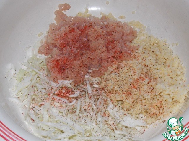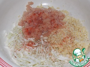 Смешать капусту, фарш, отварное пшено. Добавить аджику сухую, соль и перец. -