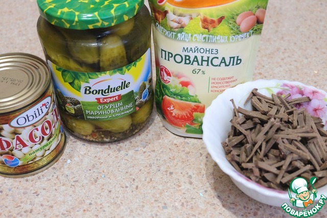 Ингредиенты для приготовления салата. Говяжью печень отварить, порезать соломкой.