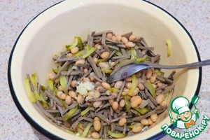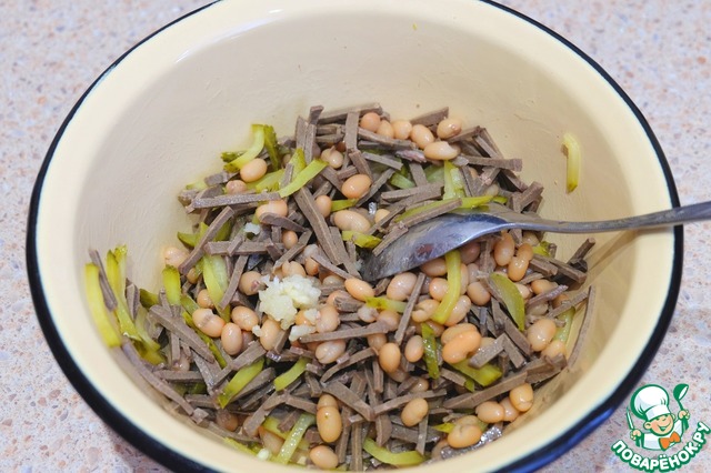 В миске соединить печеночную и огуречную соломку, добавить консервированную фасоль