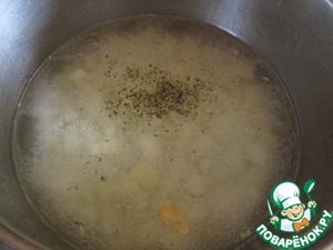 Чеснок и картофель слегка обжариваем, заливаем водой и кладем сухие травы, те, которые вы любите. У меня - прованская смесь. Доводим до кипения и варим с момента закипания 20 минут.