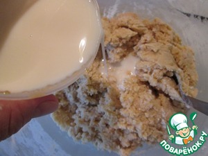 Вмешайте в сливочно - медовую смесь сначала две столовые ложки мучной смеси, затем всю оставшуюся. Влейте тонкой струйкой молоко и все хорошо перемешайте.
