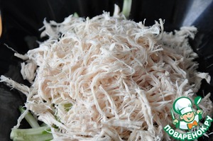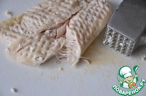Остывшую курицу отбиваем молотком, чтобы легче разбирать на волокна. Китайцы используют скалку.