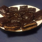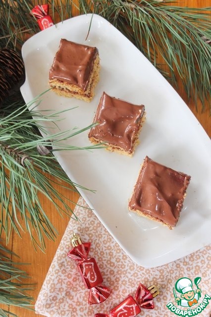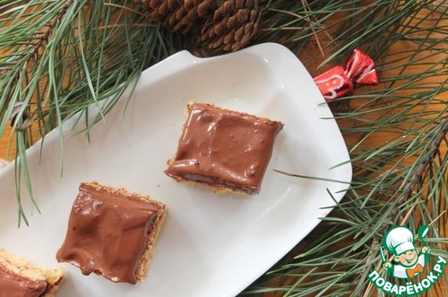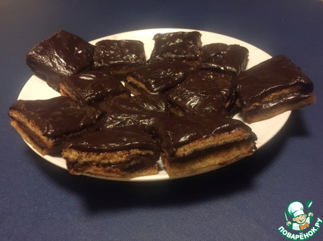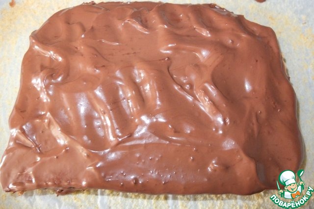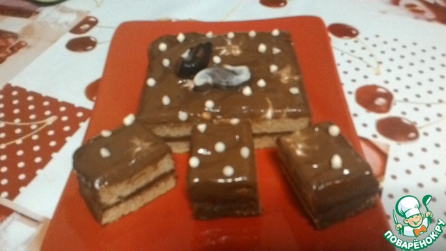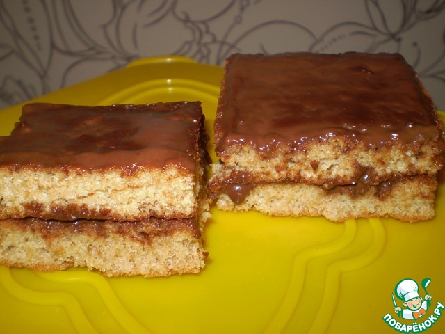 Смазываем верх коржа глазурью. Разрезаем его пополам и кладем один на другой. Нарезаем квадратиками. Охлаждаем и подаем к столу.