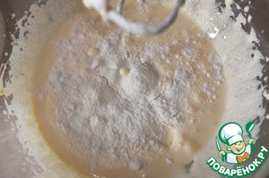 В желтки добавляем муку и сливочное масло комнатной температуры. Взбиваем на небольшой скорости миксера.