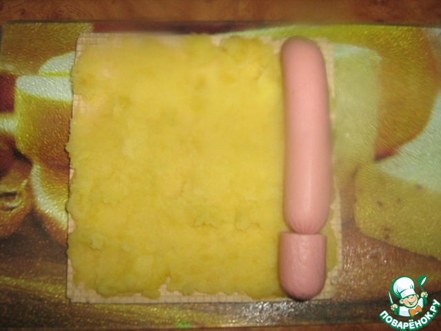 На квадратный вафельный лист размером 14,5 см на 14,5 см нанести слоем пюре. Сосиски освободить от обертки, на пюре с края положить сосиску.