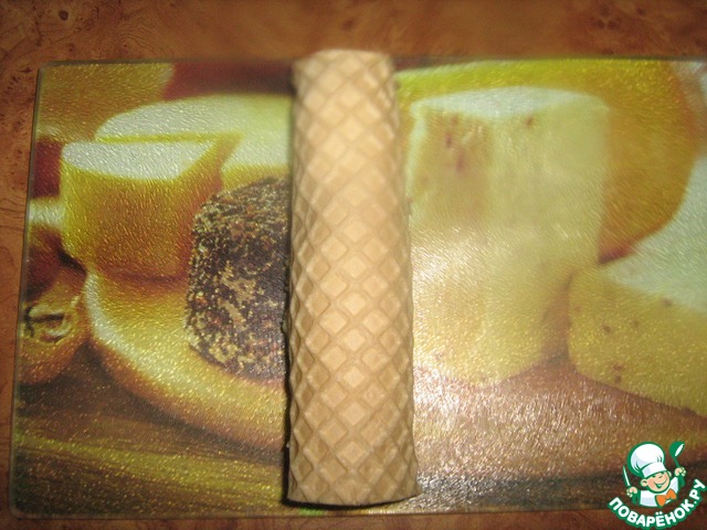 Подождать, пока вафельный лист размягчиться, но не передержать, иначе потеряет форму.
