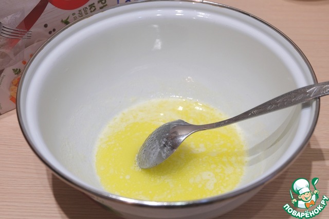 В теплое молоко (1 ст.) добавить растопленное сливочное масло (70 гр.), сахар, яичные желтки (3 шт.). Смесь взбить.