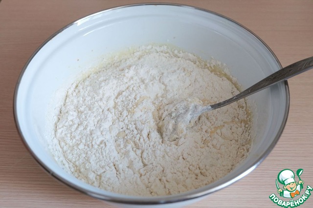 В смесь добавить постепенно муку от 2,5 до 3 стаканов.