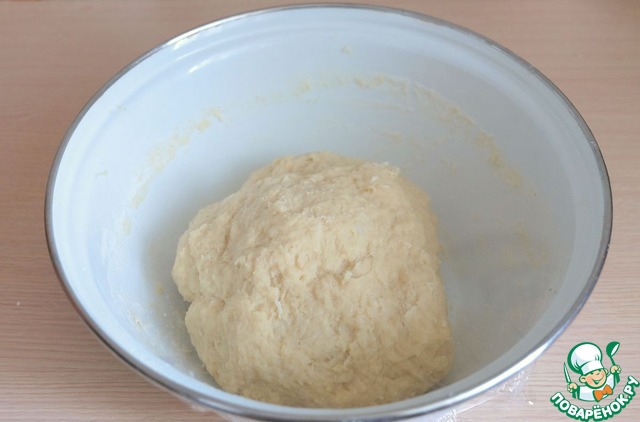 Замесить тесто. Емкость с тестом накрыть пищевой пленкой или полотенцем, поставить в теплое место для подъема.
