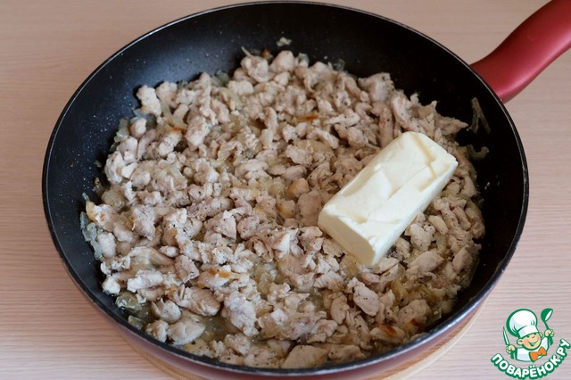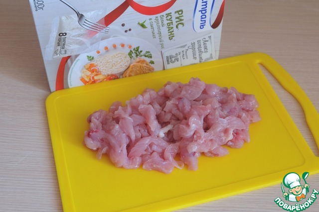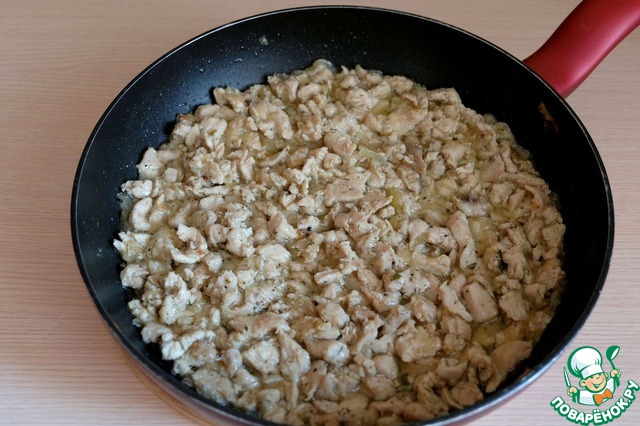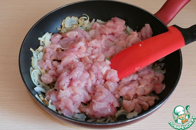 Пока поднимается тесто, приступим к приготовлению начинки для пирога. Филе грудки индейки порезать мелкими кусочками.