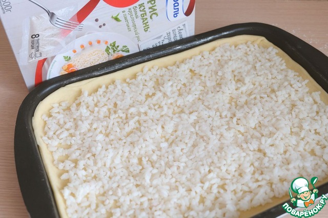 Рис ТМ Мистраль "Кубань" (1 пакетик 60 гр.) отварить в подсоленной воде до полуготовности, затем промыть в холодной воде. Рис выложить на пласт теста, разровнять тонким слоем.