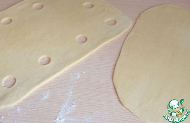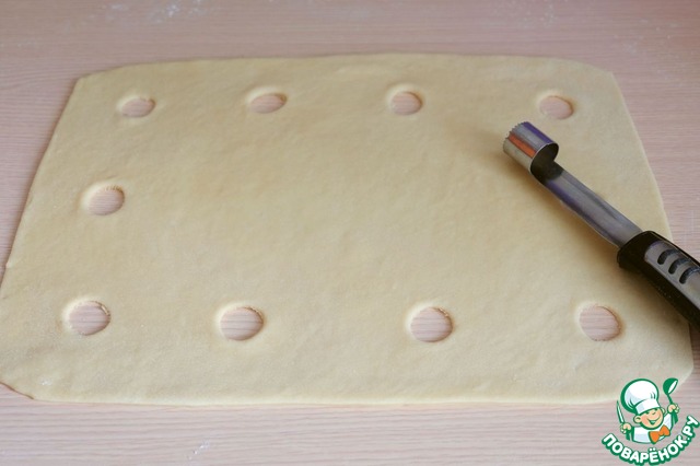 Второй кусок теста раскатать, вырубкой для мелкого печенья или высечкой для удаления сердцевины у фруктов вырезать круглые отверстия.