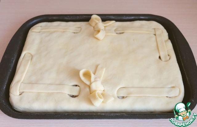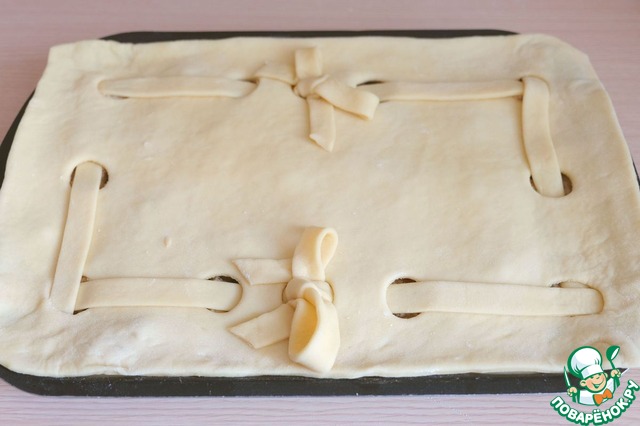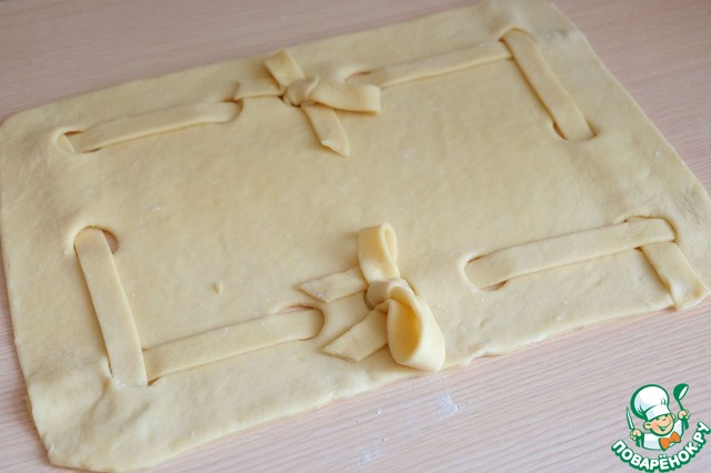 Из оставшегося кусочка теста раскатать пласт. Из этого куска теста мы сделаем ленточки-бантики для украшения пирога.