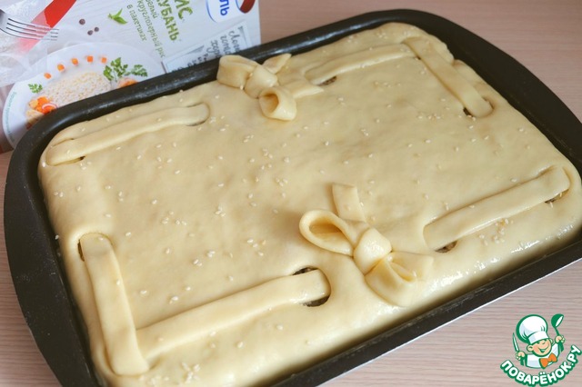 Пирог поставить на расстойку на 20-30 мин., затем смазать взбитым яйцом, посыпать кунжутом и отправить в духовой шкаф для выпекания. Выпекать при 180С. В данном случае каждый должен ориентировать на свою духовку, у всех они разные. Я даю лишь ориентировочную температуру.