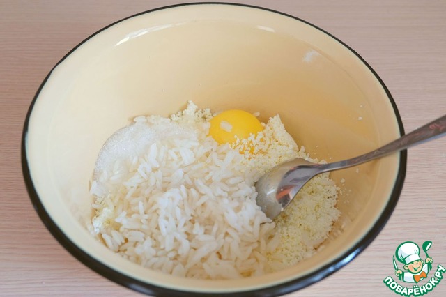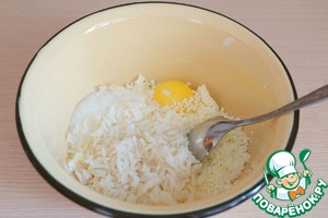 Добавить в миску отварной рис, яичный желток (1 шт.), протертый через металлическое сито творог.