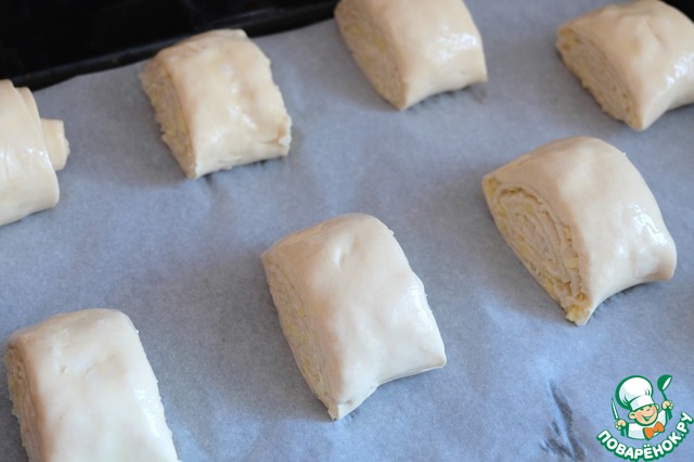 Выложить слойки на противень, застланный пекарской бумагой. Отправить в разогретый духовой шкаф для выпекания. Выпекать при 180°С до готовности. Хочу обратить внимание, что я даю ориентировочную температуру. В данном случае каждый должен ориентироваться на свою духовку, у всех они разные.
