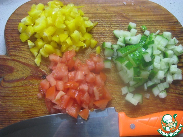 Небольшими кусочками нарезать перец, огурец и помидор.
