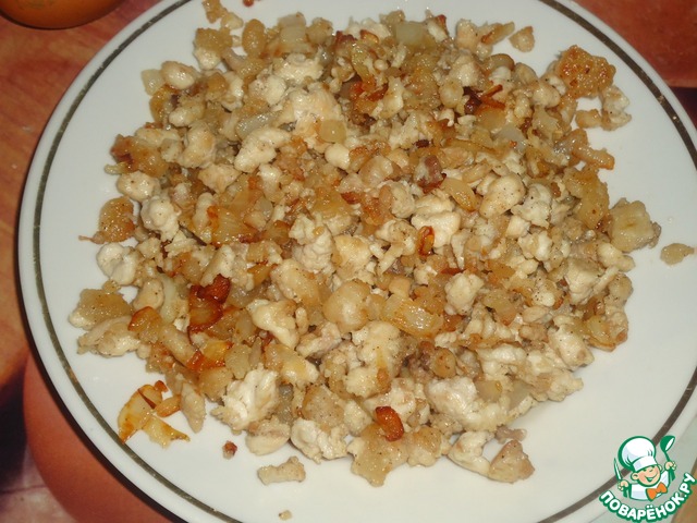 Лук мелко порезать и пережарить с куриным фаршем, посолить, поперчить.