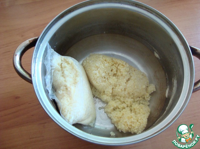 В пшено выкладываем творог и разбиваем яйцо. Перемешиваем и пробуем на соль. По желанию досаливаем.