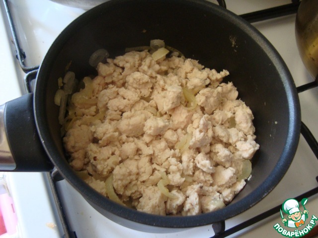 Выкладываем к луку фарш и обжариваем. Солим по вкусу. Я не жарила, а притомила до готовности почти. Можно поперчить.