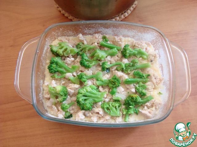 Выкладываем 2/3 фарша и сверху разобранное брокколи на соцветия.