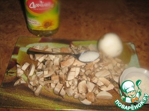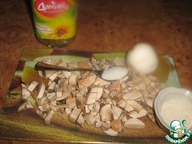 Для этого их порезать, приготовить соль, 1 чайную ложку сахара (всегда при жарке к шампиньонам добавляю немного сахара для вкуса), подсолнечное рафинированное масло).