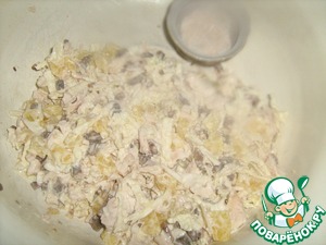 • Подготовить ингредиенты: сваренное в подсоленной воде и порезанное кубиком куриное филе; пожаренные грибы; нашинкованную пекинскую капусту; порезанные мелкими кусочками ананасами; подсушенные в духовке и мелко размолотые скалкой грецкие орехи. Майонез.