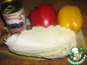• Подготовить для украшения сладкие перцы красного и желтого цвета; целые листья пекинской капусты; маслины (понадобиться всего 1 шт. или можно заменить перцем - горошком) для "глаза".