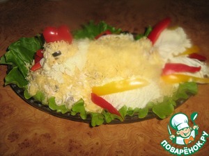 • Украсить салат: с 2-ух сторон вставить листья капусты -"крылья" и приделать "хвост" в несколько слоев. Между слоями вставить полосы красного и желтого сладкого перцев. Гребень и клюв, сережки - из красного перца. "Глаза" - кусочки маслины.