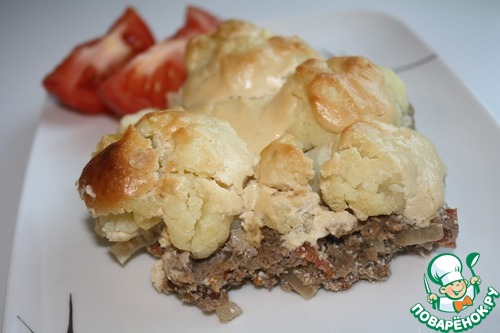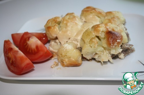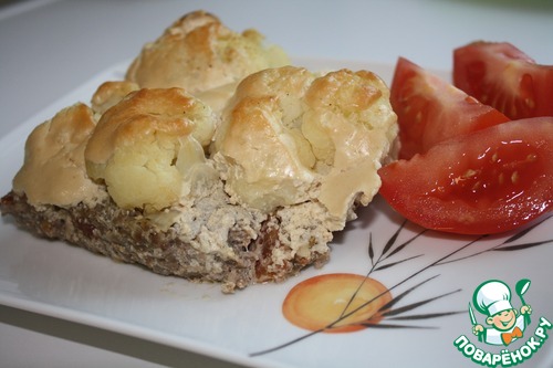 Собираем нашу запеканку. На противень выкладываем фарш. Затем капустные соцветия разбираем на еще более мелкие и втыкаем в фарш по всей поверхности. Свеху поливаем соусом.