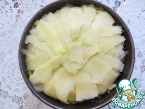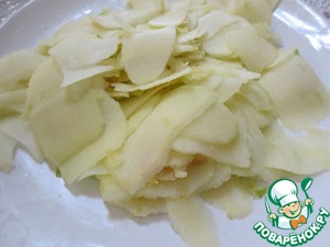 Яблоки очистить от кожуры и при помощи инструмента для чистки кожуры, из яблочной мякоти нарезать"лепестки" (тонкие ломтики)