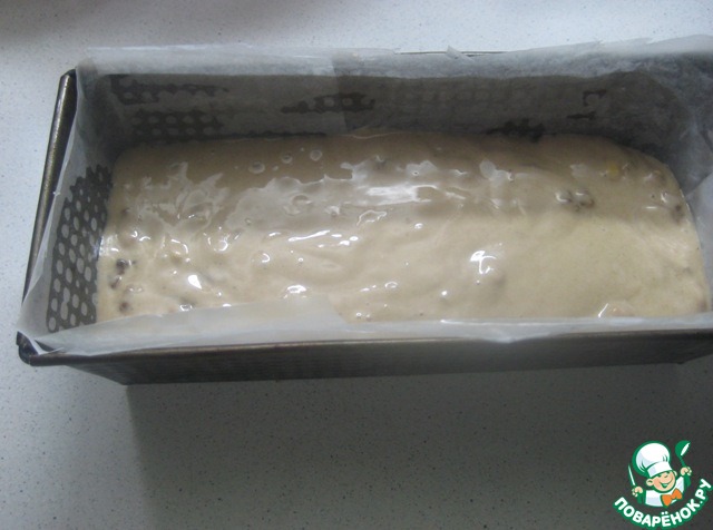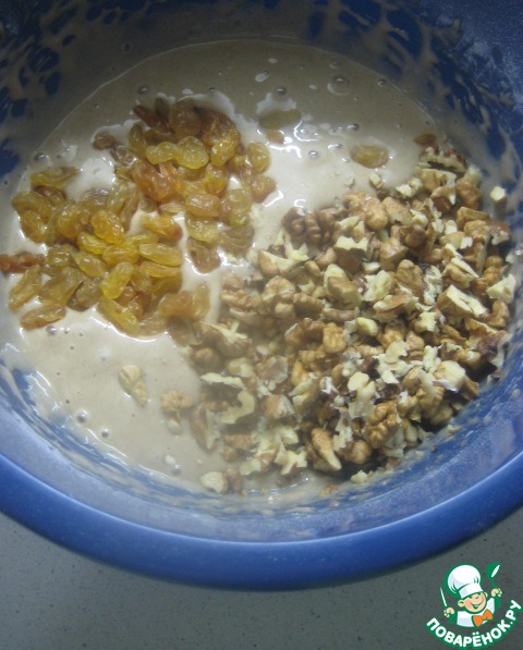 Добавляем крупно рубленные орехи и изюм (изюм предварительно нужно залить горячей водой, дать постоять минут 10, затем воду слить, а изюм просушить бумажной салфеткой). Аккуратно перемешать тесто, распределяя орехи и изюм.