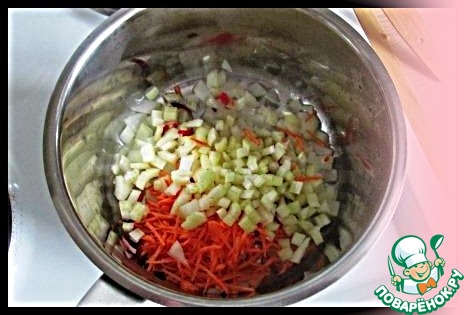 Добавить морковь и сельдерей и на малом огне довести до мягкости, минут 10