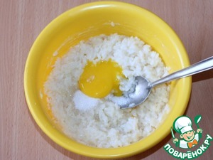 5... куриный желток, 1 ст. л. сахара, 1/3 ч. л. соли и рис, перемешиваем и измельчаем блендером до однородной массы.