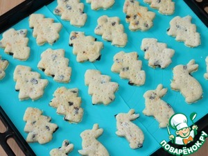 7. Присыпаем разделочную доску мукой и раскатываем тесто, вырезаем разные фигурки толщиной 5-7 мм, и кладем на смазанный маслом противень. Силиконовый коврик, смазывать не надо.