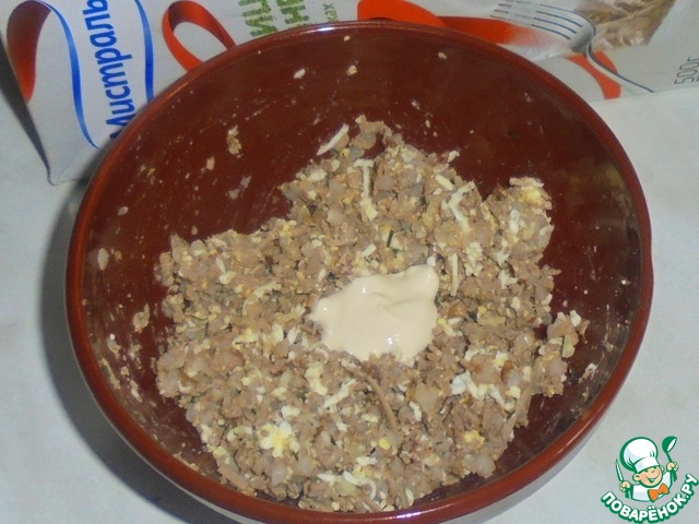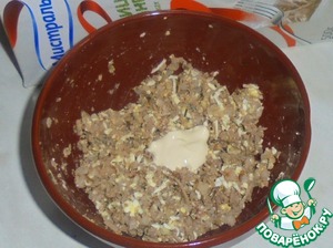 Добавляем сметану, или по желанию майонез. Перемешиваем до однородности.
