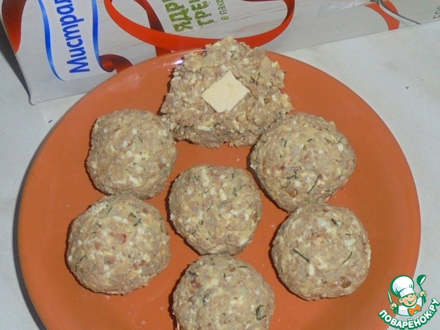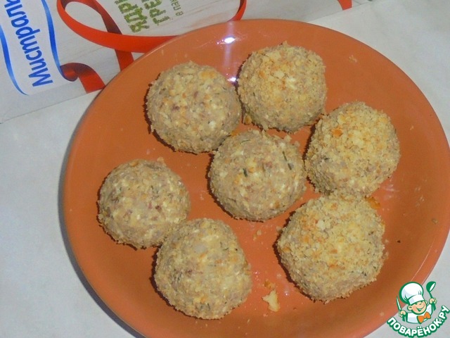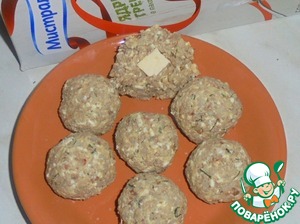 Скатать шарики, а внутрь поместить кубик твердого сыра.