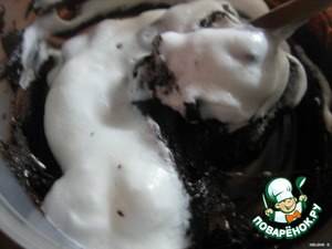 Аккуратно соединить четвертую часть взбитых белков с шоколадной смесью, затем добавить оставшиеся белки и все соединить.