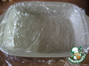 Смазать маслом прямоугольную форму длиной 22 см и застелить ее пищевой пленкой так, чтобы она свисала за бортики.