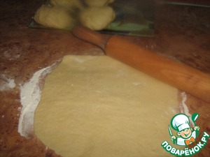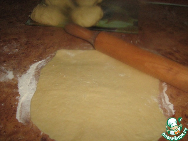 Взять одну часть, тонко раскатать на подпыленном мукой столе. -