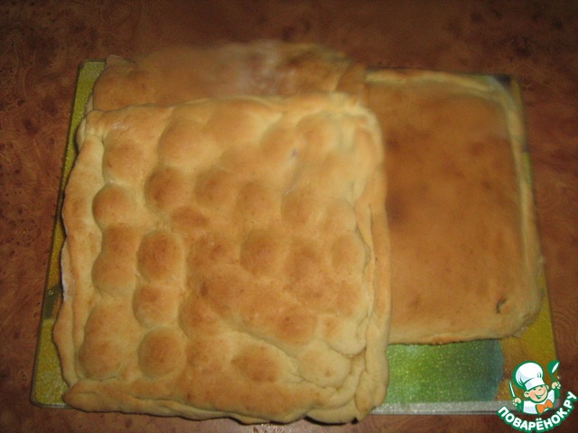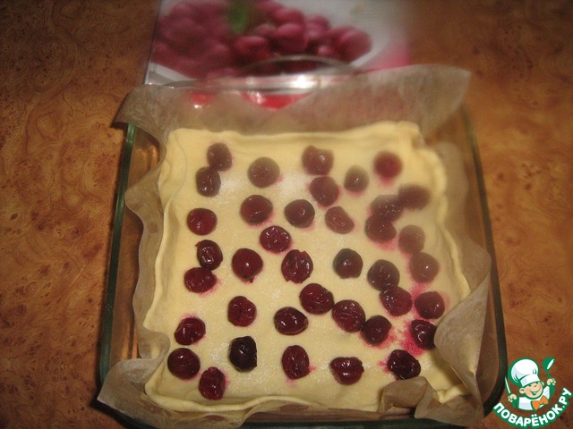 Раскатать второй пласт теста, закрыть ним вишни, соединяя края, чтоб при выпечке не вытекал сок. Выпечь при температуре 180 градусов 15 минут до зарумянивания.