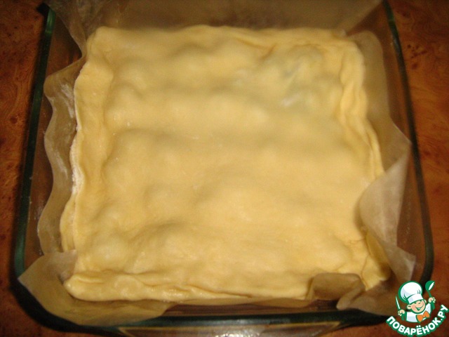 Форму застелить сухой бумагой для выпечки, сделав бортики.