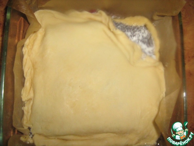 Раскатать последнюю, шестую часть теста, закрыть ею мак, плотно соединив края теста. -
