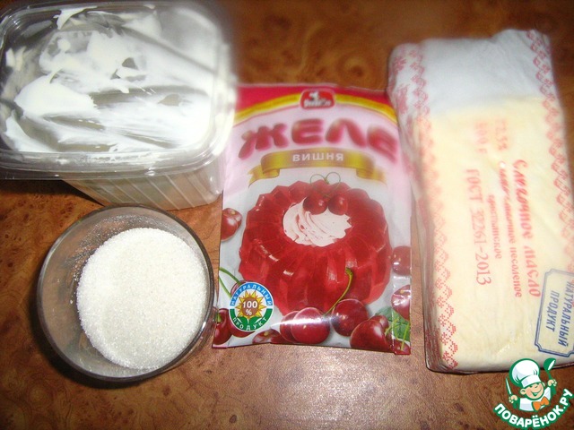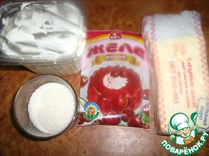 Подготовить ингредиенты для крема: вишневое желе, сметану, сахар, сливочное масло.