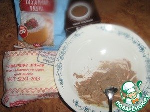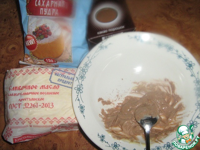 Для украшения смешать 30 грамм мягкого сливочного масла с какао-порошком и сахарной пудрой.