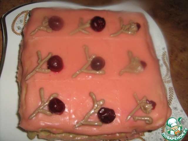 Уложить коржи, чередуя и промазывая остывшим кремом: корж с вишнями - крем. Корж с маком - крем. Корж с вишнями - крем.