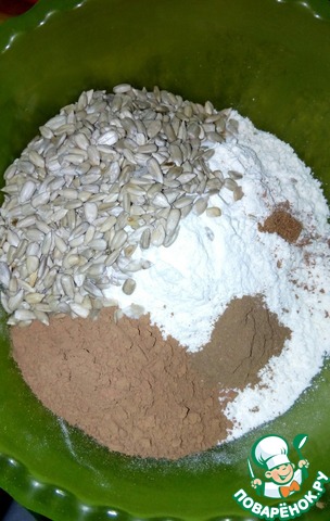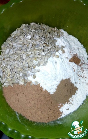 Просеять через сито муку и какао, смешать с разрыхлителем, корицей, молотой гвоздикой, мускатным орехом и семечками подсолнечника.