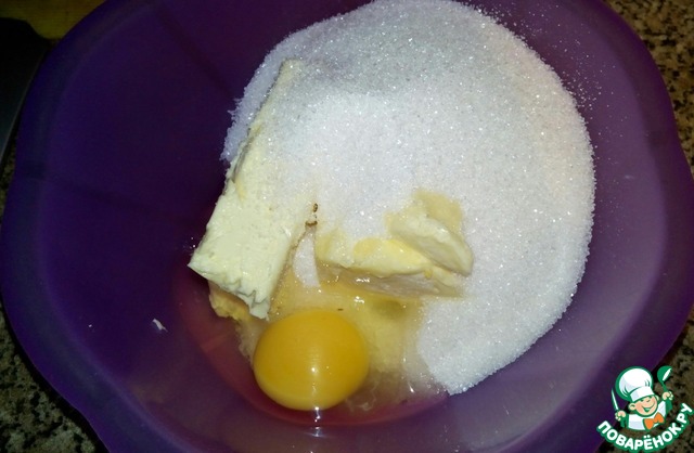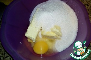 Растереть сливочное масло с сахарным песком. По одному ввести яйца, хорошо и быстро перемешивания. Сразу соединить с мучной массой.