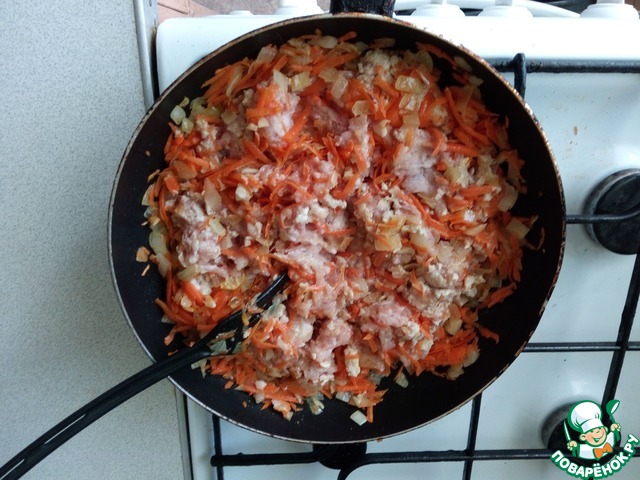 Добавляем к овощам фарш и на довольно сильном огне обжариваем все вместе, постоянно помешивая и разламывая кусочки фарша. В процессе добавляем соевый соус.