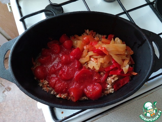 Как только фарш подрумянится, перекладываем его в более глубокую посуду (у меня утятница), добавляем нарезанный соломкой перец, томаты вместе с соком, перец чили. Можно добавить немного воды либо бульона. Если хотите чуть покислее, добавьте ложку-другую томатной пасты. Накрываем крышкой и оставляем тушиться на медленном огне 25 минут.